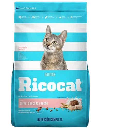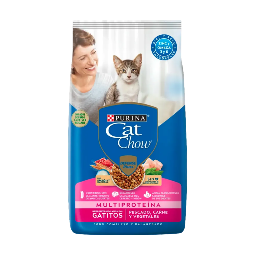 Alimento para gatitos bebés sabor pescado, pollo y leche.