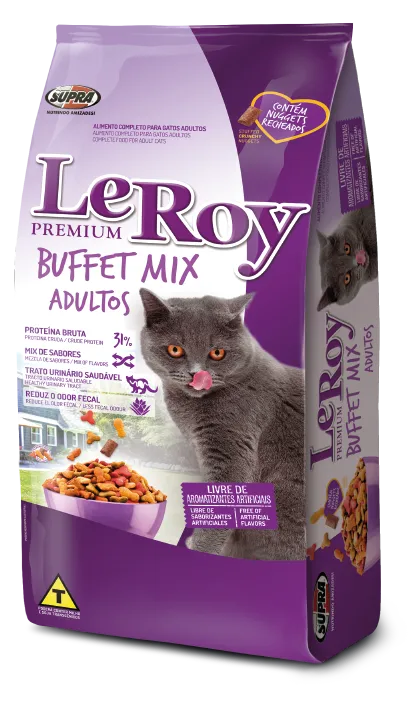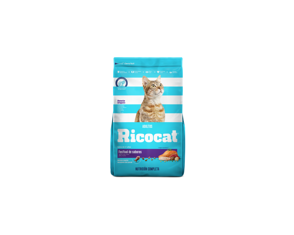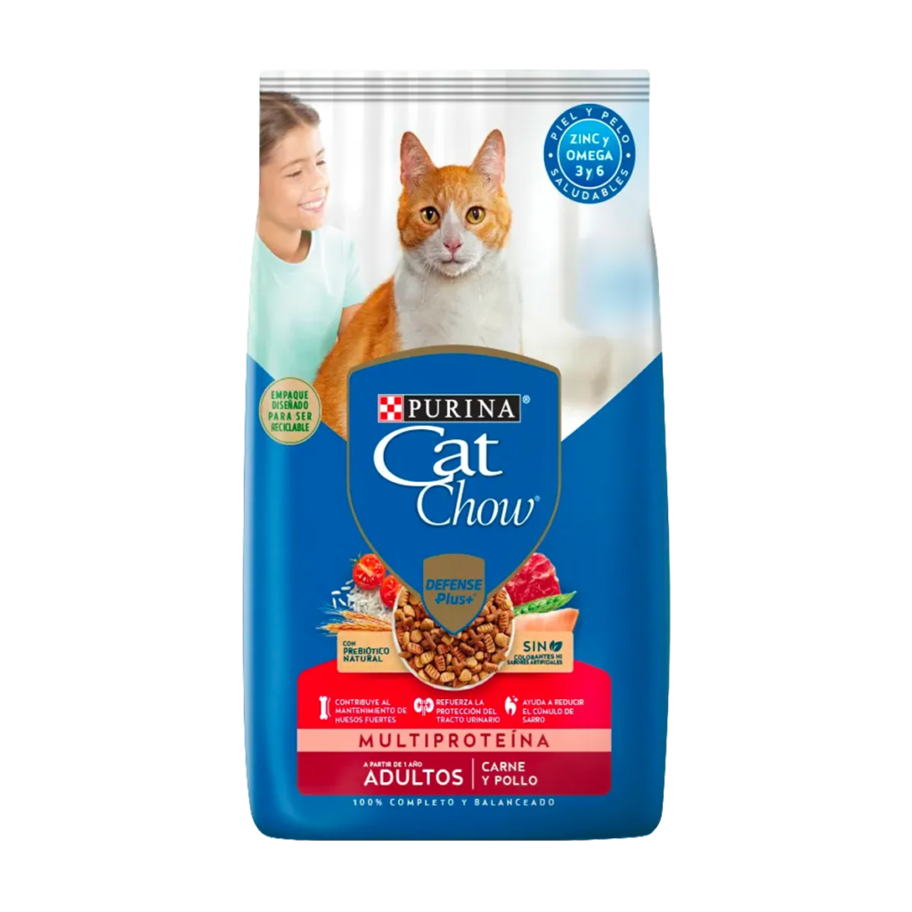 Alimento para gatos adultos sabor carne, pollo y pescado.